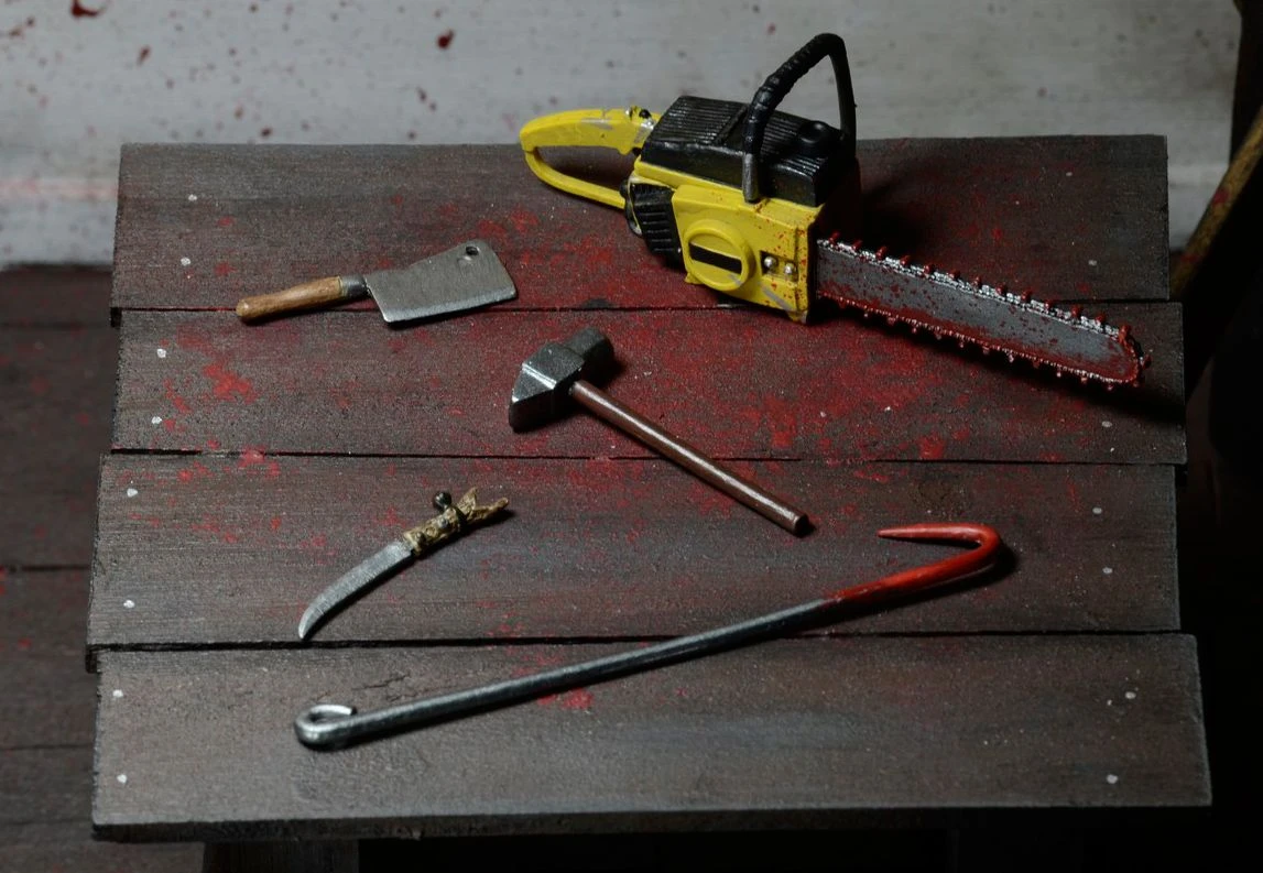Diese ultimative Leatherface Figur kommt mit zwei austauschbaren Köpfen, Kettensäge, Messer, Fleischhaken, Hackbeil, Fäustling, sowie einer standesgemäßen Metzger-Schürze aus Vinyl.