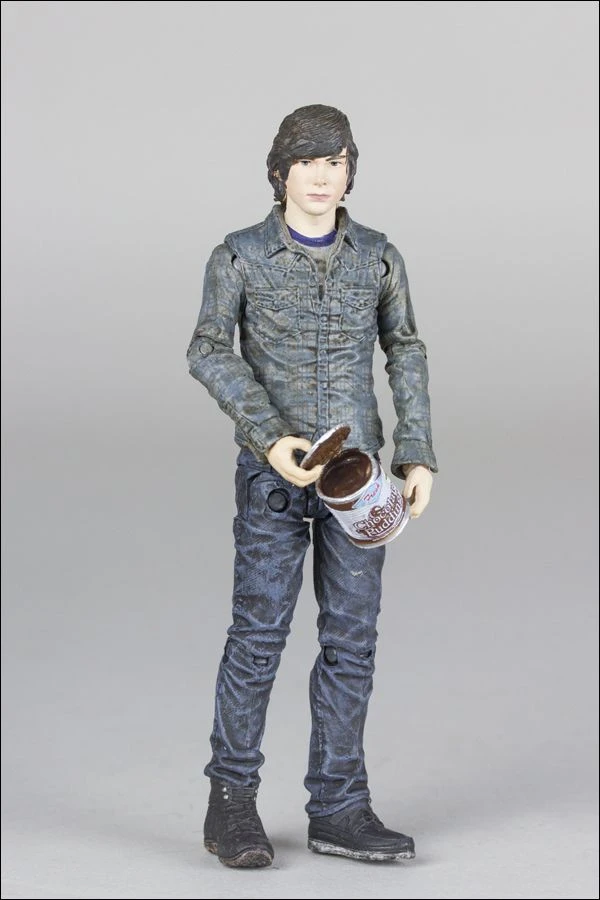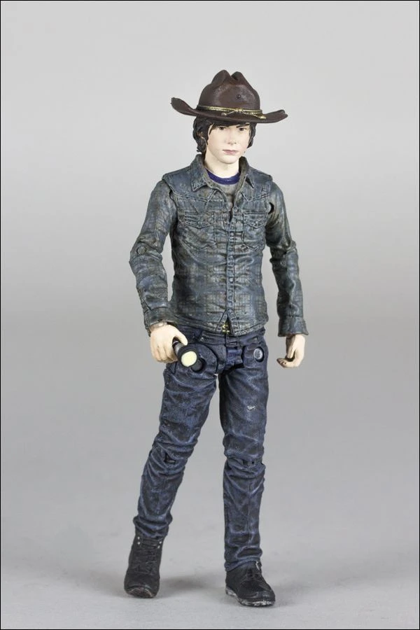 Die bewegliche Figur des Jungen Carl Grimes kommt mit Cowboyhut, großem Kerzenständer aus Terminus, geöffneter Konservendose, sowie einer Taschenlampe als Zubehör.