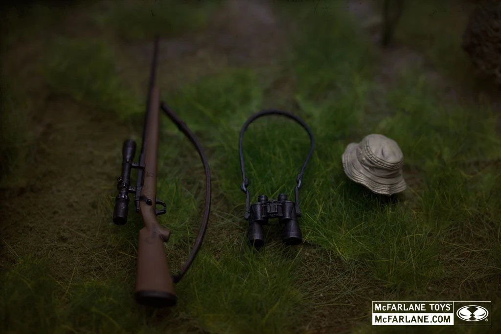 Die bewegliche Figur des gerade verstorbenen Dale kommt mit Jagdgewehr, Feldstecher und seinem Schlapphut.